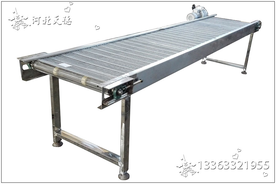 面包蛋撻輸送機(jī),烘培冷卻流水線設(shè)備常用的有不銹鋼網(wǎng)帶輸送機(jī),食品皮帶輸送機(jī)以食品輸送帶作牽引件輸送物料,運(yùn)行平穩(wěn)、造型美觀、使用壽命長(zhǎng)。運(yùn)用食品輸送帶的連續(xù)或間歇運(yùn)動(dòng)來(lái)輸送各種輕重不同的物品,面包蛋撻輸送機(jī)輸送帶強(qiáng)度高、伸縮性小、不易變形、易保養(yǎng),而且衛(wèi)生、耐腐蝕,在惡劣工作環(huán)境中性能強(qiáng),使用壽命長(zhǎng)。面包蛋撻輸送機(jī)有適用于食品、副食品、水產(chǎn)品的加工生產(chǎn)線,包裝輸送線和電子、金屬配件加熱、烘烤線,在食品、醫(yī)藥、日用化工等行業(yè)廣泛使用。